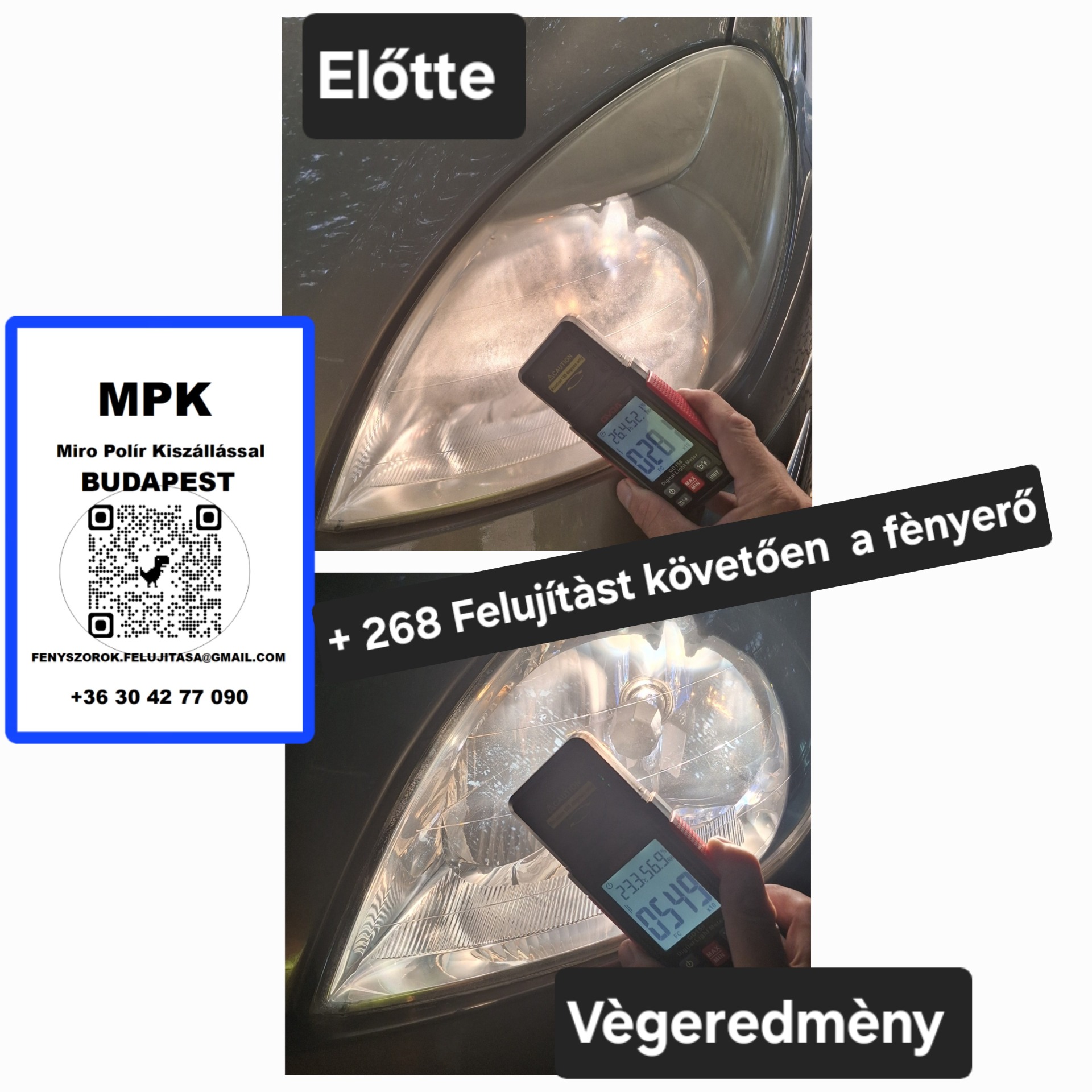 🇭🇺 Fényszóró felújítás – minőség, garancia, házhoz megyek- Költséghatékony megoldás Budapesten, Esztergomban - Kiszerelés nélkül, így időt és pénzt spórol - Felújítás személyes jelenlét nélkül is megoldható - Fényerőmérés csak személyes találkozás esetén kérhető ez +2000Ft jelent. Írásos garancia. Két csomag közül választhatnak: - 1 év vissza mattulás ellen - 6 év garancia védőfóliával. Hétvégén, ünnepnapokon, esőben is dolgozom Kérdése van? Hívjon bátran: ☎️ 06 30 42 77 090 Ha nem tudom fogadni a hívást, akkor rövid időn belül visszahívom.