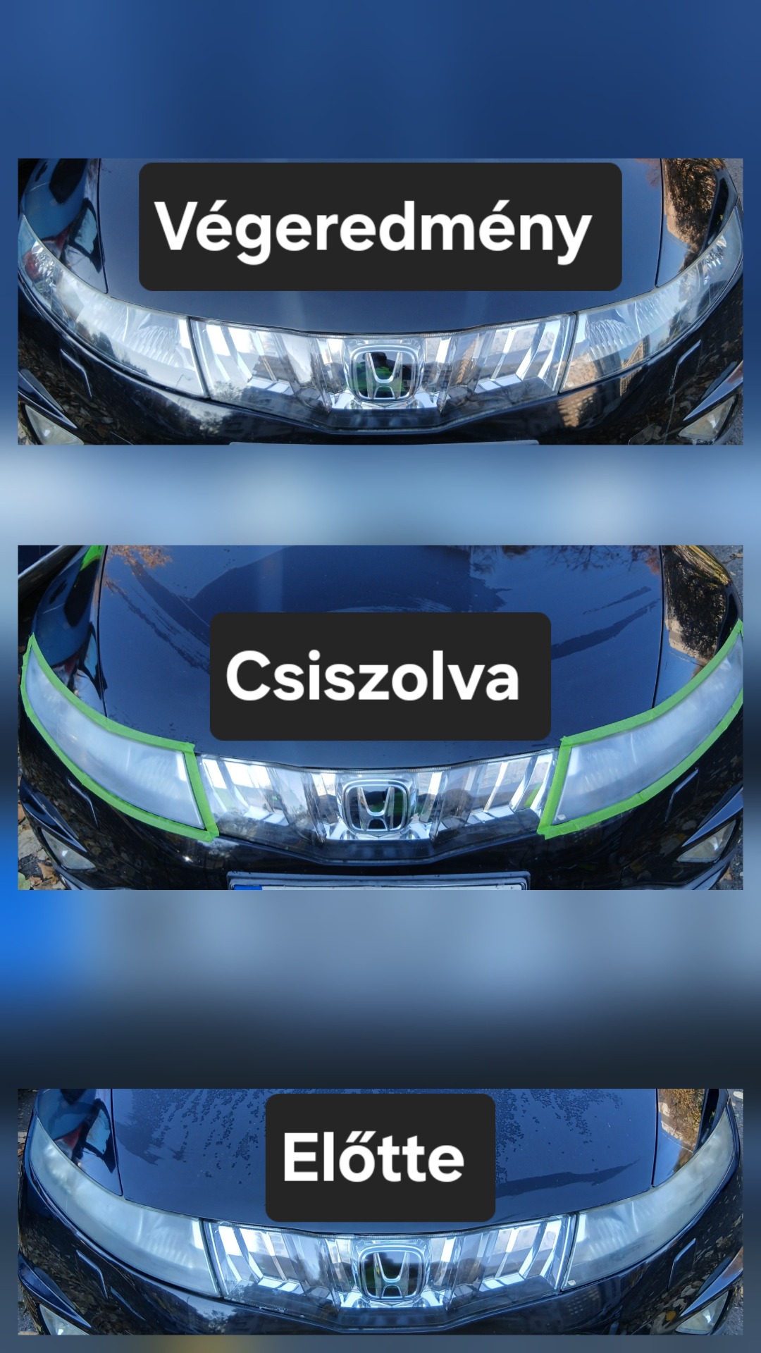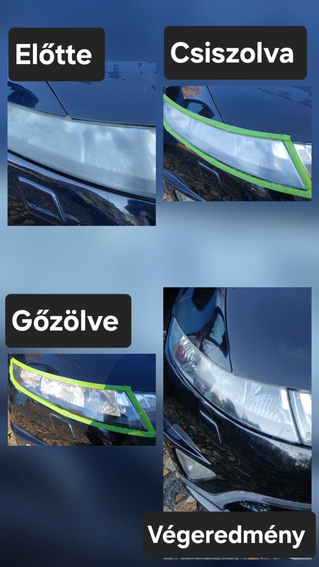 Egy műhelyben szakszerűen kiszerelt fényszóróknak a felújítását is vállalom, de akár beszerelt állapotában, egy műhelyben kiszállással is el tudom végezni a felújítást. Tehát nincs lehetetlen, csak ember tehetetlen. Sőt, igény szerint védőfóliával el is tudom látni a már felújított fényszórókat.