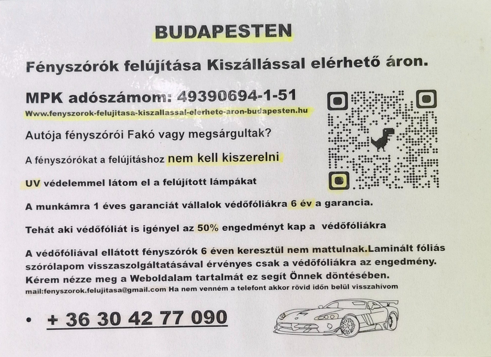 A fényszórók felújítása nálam nemcsak kiváló minőségű, de elérhető áron történik! Ráadásul most mindenki számára elérhető egy 30%-os kedvezmény a QR-kódos matricás ajánlatommal! Az akciók további részletei és több mint 150 referenciafotó lessz látható egy az árlistához is görgessen tovább kérem. Számomra a minőség mindig fontosabb, mint a mennyiség, és az elégedett ügyfeleim azok, akik segítenek az utamon. Bátran hívjon,ha nem találta meg azt amit keresett én a leg rövidebb időn belül vissza fogom Önt hívni ,ha ne tutom felvenni a telefont